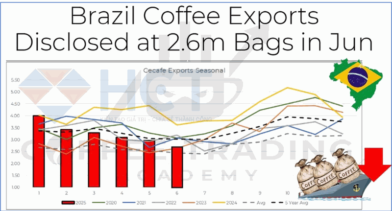 2. Xuất khẩu cà phê của Brazil trong tháng 6 ghi nhận hiệu suất yếu trong bối cảnh lịch sử. Mặc dù được công bố ở mức 2,6 triệu bao (gồm 1,8 triệu bao Arabica và 476 nghìn bao Robusta), con số này vẫn giảm 27,7% so với cùng kỳ năm trước và giảm 12,4% so với tháng trước, đồng thời thấp hơn 13,3% so với mức trung bình 3 tháng của 5 năm gần nhất.