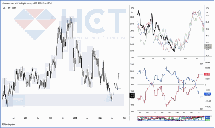4. Giá đường có thể tạo cơ hội mua vào dài hạn vào cuối quý này, khi đạt mức thấp nhiều năm trên biểu đồ tháng, đồng thời chịu ảnh hưởng tích cực từ yếu tố mùa vụ và vị thế nhà đầu tư (COT).