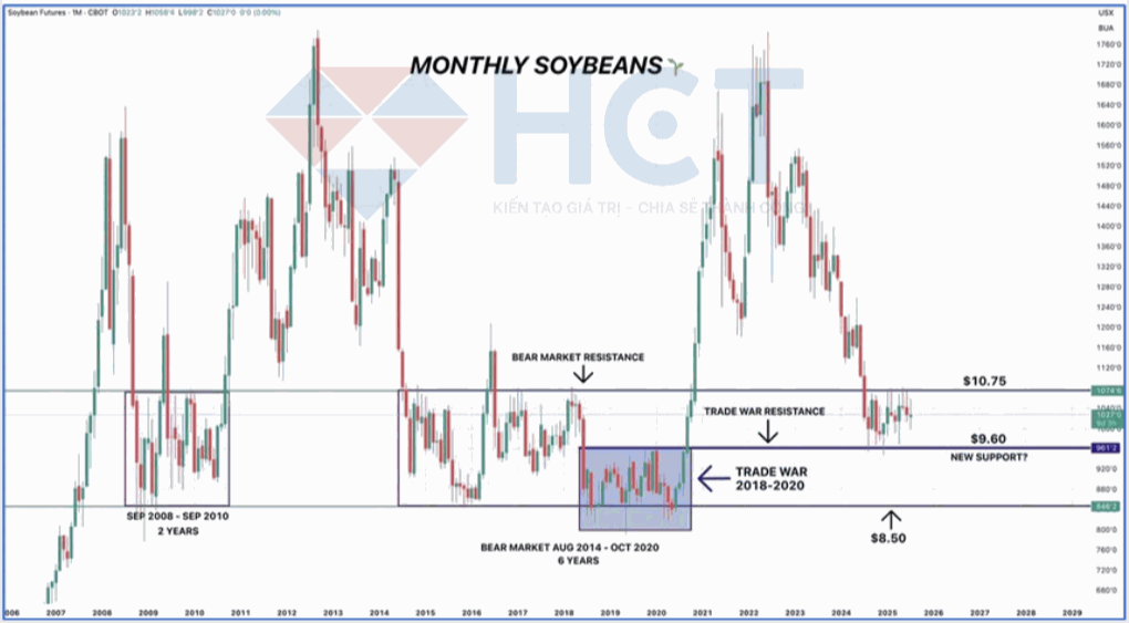 1. Có thể nói, thị trường đậu tương đã thiết lập mức đáy dài hạn mới. Mức thấp nhất trong năm ngoái là 9,60 USD đây cũng từng là mức cao trong giai đoạn chiến tranh thương mại và ngưỡng kháng cự cũ đã trở thành vùng hỗ trợ mới. Một số nhà phân tích cho rằng đây là dấu hiệu cho thấy đậu tương có thể đã tìm được vùng đáy ổn định cho chu kỳ sắp tới. Trong quá khứ, mức 10,75 USD từng là ngưỡng kháng cự quan trọng trong thị trường giá xuống, và năm nay, giá một lần nữa gặp khó khăn khi cố gắng vượt qua mốc này. Nếu giá đậu tương có thể vượt qua ngưỡng 10,75 USD một cách dứt khoát, đó có thể là tín hiệu tích cực, mở ra triển vọng tăng trưởng mạnh mẽ hơn cho thị trường trong thời gian tới.