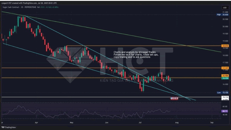 4. Giá đường ghi nhận mức tăng nhẹ 1%, tuy nhiên biểu đồ vẫn chưa cho thấy sự bứt phá rõ ràng, tiếp tục đi ngang trong mô hình tích lũy theo dạng “cờ tăng” (bull flag). Theo nhận định kỹ thuật, xu hướng tăng vẫn được duy trì và giá có thể tiến tới mốc 17,14 trong thời gian tới. Đây là giai đoạn cần sự kiên nhẫn, và nhà đầu tư vẫn có thể duy trì vị thế mua.
