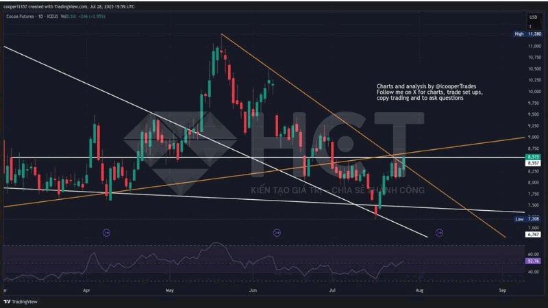 5. Giá ca cao tăng 3% trong phiên thứ Hai, tuy nhiên vẫn đang đối mặt với nhiều ngưỡng kháng cự mạnh ngay phía trên. Khi chưa thể vượt qua các mốc kháng cự này, xác suất điều chỉnh giảm vẫn chiếm ưu thế. Dù vậy, việc giá liên tục kiểm định các vùng kháng cự cho thấy áp lực mua đang tăng dần. Với diễn biến chưa rõ ràng, đây không phải là thời điểm phù hợp để mở vị thế giao dịch mới.