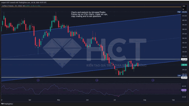 6. Giá cà phê tăng nhẹ 1% trong phiên, nhưng chưa tạo ra tín hiệu thay đổi rõ rệt trên biểu đồ kỹ thuật. Hiện giá vẫn dao động quanh vùng đáy của kênh song song và sát ngưỡng kháng cự 313. Thị trường đang trong trạng thái lưỡng lự, với xác suất tăng vượt 313 hoặc giảm về kiểm định lại vùng hỗ trợ 273 là ngang nhau. Trong bối cảnh đó, tôi tiếp tục duy trì vị thế mua và sẽ cân nhắc gia tăng nếu giá điều chỉnh về mốc 273.