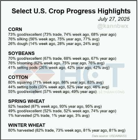 1. Theo báo cáo mới nhất, điều kiện cây ngô tại Mỹ đã giảm 1 điểm phần trăm, đúng như dự báo trước đó. Tuy nhiên, điều kiện cây đậu nành lại ghi nhận mức cải thiện bất ngờ, tăng 2 điểm phần trăm thay vì giảm 1 điểm như dự kiến. Trong khi đó, tình trạng mùa màng của lúa mì vụ xuân và cây bông cũng đồng loạt suy giảm so với tuần trước. Đáng chú ý, Bộ Nông nghiệp Hoa Kỳ (USDA) cho biết năng suất lúa mì vụ xuân năm nay đang tiến sát mức của cùng kỳ năm ngoái, với 49% diện tích được đánh giá đạt loại “tốt đến xuất sắc”, so với mức 74% vào thời điểm này năm 2024.