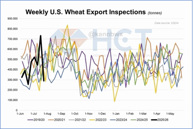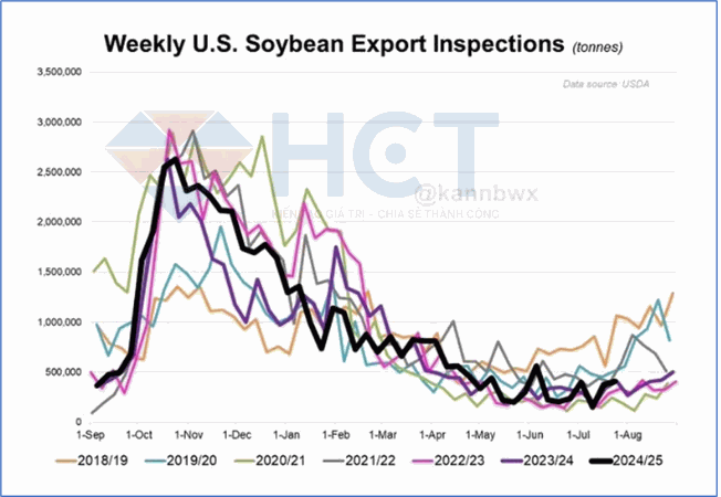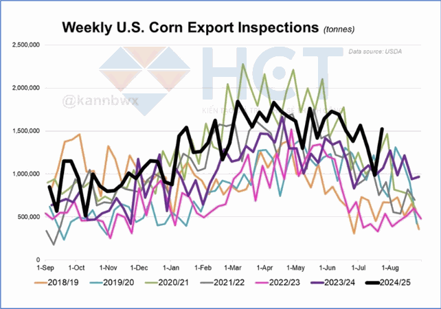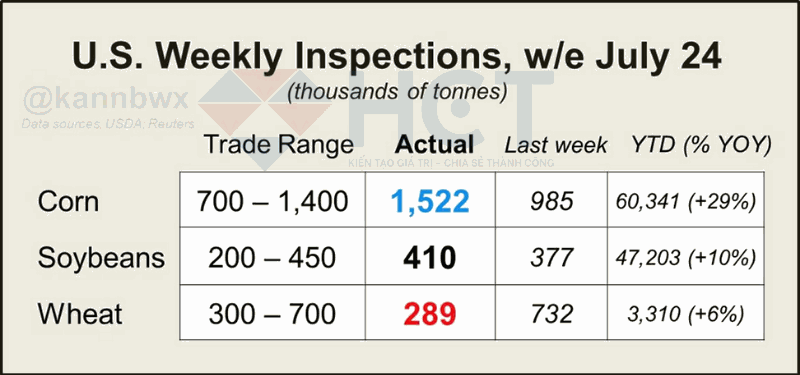 2. Theo báo cáo mới nhất, số liệu kiểm tra xuất khẩu ngô của Mỹ trong tuần qua đã vượt tất cả các dự báo, đánh dấu sự phục hồi mạnh mẽ sau khi tụt dưới kỳ vọng ở tuần trước đó. Đây cũng là tuần có khối lượng xuất khẩu ngô cao thứ hai trong hơn 40 năm, cho thấy nhu cầu thị trường đang tăng trở lại. Xuất khẩu đậu nành tuy không ghi nhận đơn hàng nào từ Trung Quốc, nhưng vẫn đạt mức khả quan và ổn định. Ngược lại, xuất khẩu lúa mì có xu hướng giảm nhẹ, sau khi đã ghi nhận khối lượng lớn bất thường vào tuần liền trước.