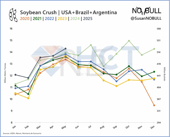 4. Hoạt động ép đậu tương tại nhóm ba quốc gia xuất khẩu sản phẩm từ đậu tương lớn nhất thế giới đã ghi nhận 17 tháng liên tiếp lập kỷ lục mới, phản ánh xu hướng tăng trưởng mạnh mẽ của ngành. Thành tích ấn tượng này chủ yếu được thúc đẩy bởi biên lợi nhuận hấp dẫn và việc mở rộng công suất chế biến, đặc biệt là tại thị trường Hoa Kỳ, nơi đang dẫn đầu về tốc độ tăng trưởng trong lĩnh vực này.