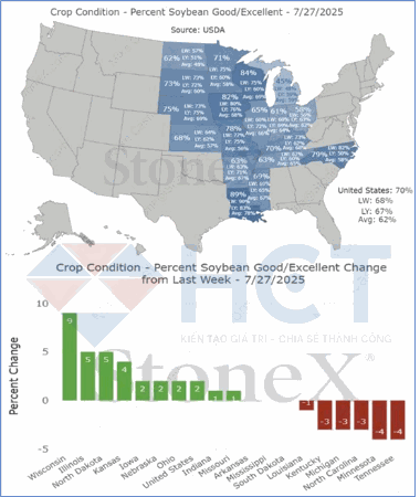 6. Sau khi bất ngờ giảm trong tuần trước, điều kiện cây đậu tương tại Mỹ đã phục hồi, tăng 2 điểm phần trăm lên mức 70% được đánh giá tốt đến xuất sắc mức cao nhất kể từ năm 2020. Các bang ghi nhận cải thiện mạnh nhất gồm Wisconsin (+9%), Illinois và North Dakota (cùng +5%).
