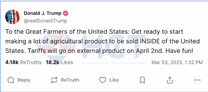 5. Tổng thống Donald Trump vừa kêu gọi nông dân Mỹ chuẩn bị đẩy mạnh sản xuất nông sản để tiêu thụ nội địa, trong bối cảnh Mỹ sẽ áp thuế lên hàng hóa nông sản nhập khẩu bắt đầu từ ngày 2/4/2025. Động thái này nhằm ưu tiên tiêu dùng sản phẩm trong nước, tạo điều kiện thuận lợi cho nông dân nội địa.