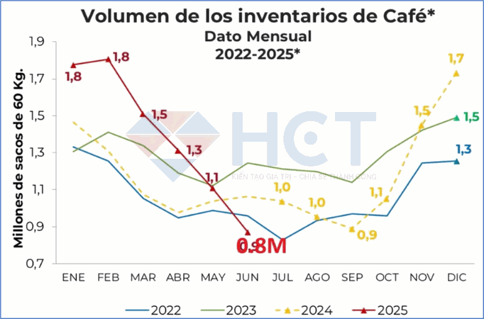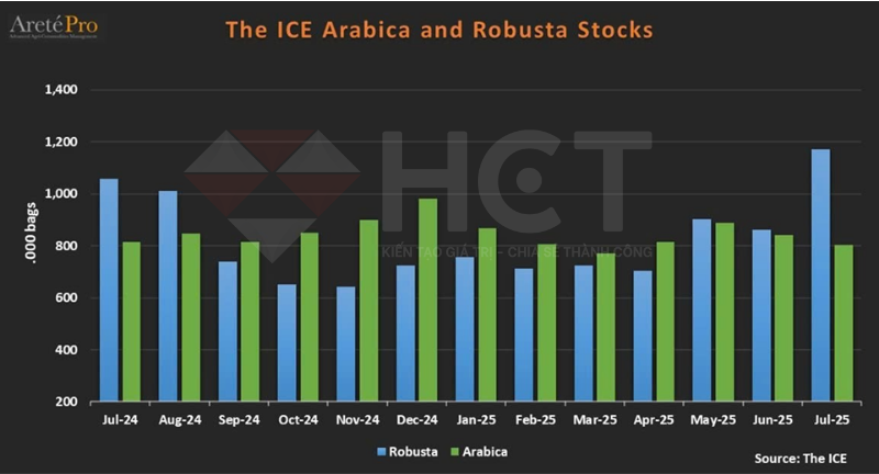 2. Diễn biến tồn kho cà phê Arabica và Robusta tại sàn ICE từ tháng 7/2024 đến tháng 7/2025: Trong suốt giai đoạn, tồn kho Arabica duy trì ổn định quanh mức 700.000–900.000 bao, trong khi tồn kho Robusta biến động mạnh hơn và tăng vọt vào tháng 7/2025, vượt 1,2 triệu bao mức cao nhất trong vòng một năm. Sự gia tăng mạnh của Robusta vào cuối kỳ có thể phản ánh xu hướng dồn hàng vào kho do nhu cầu tiêu thụ chậm hoặc sản lượng tăng, từ đó tác động trực tiếp đến cung–cầu và giá cà phê trên thị trường