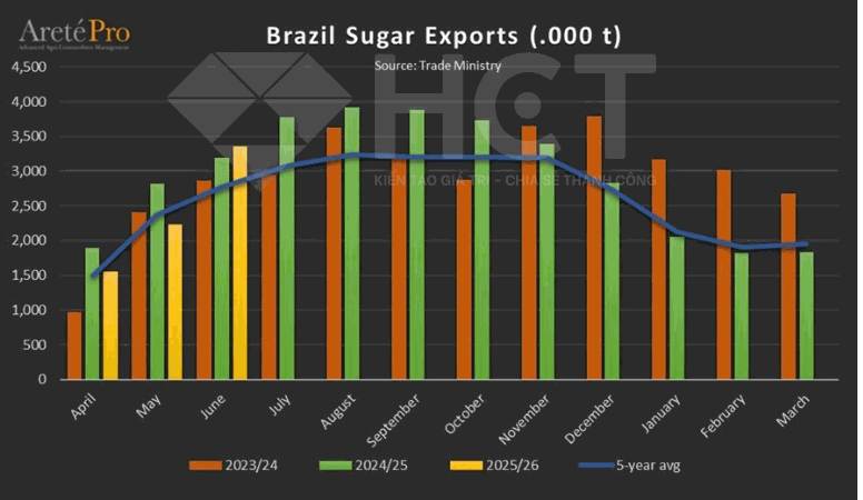3. Theo dữ liệu từ Bộ Thương mại Brazil, xuất khẩu đường trong tháng 6/2025 đạt 3,4 triệu tấn, tăng 21% so với mức trung bình 5 năm và tăng 5% so với cùng kỳ năm ngoái. Tuy nhiên, tính lũy kế từ tháng 4 đến nay, tổng khối lượng xuất khẩu vẫn thấp hơn 9% so với năm ngoái, dù vẫn cao hơn 8% so với trung bình 5 năm, cho thấy xu hướng phục hồi nhưng chưa hoàn toàn ổn định.