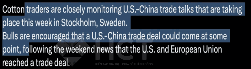 7. Các nhà giao dịch bông đang theo dõi chặt chẽ các cuộc đàm phán thương mại giữa Mỹ và Trung Quốc diễn ra trong tuần này tại Stockholm, Thụy Điển. Thị trường tỏ ra lạc quan khi kỳ vọng một thỏa thuận thương mại giữa hai nền kinh tế lớn có thể được thiết lập trong thời gian tới, đặc biệt sau thông tin Mỹ và Liên minh châu Âu đã đạt được thỏa thuận thương mại vào cuối tuần qua.