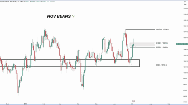2. Đậu tương đã phục hồi 61,8% so với nhịp giảm từ đỉnh tháng 6. Thị trường tạm chững lại sau đợt tăng, khi phiên thứ Sáu đóng cửa dưới ngưỡng này và để lại cây nến giảm. Tuy nhiên, nếu vượt được mốc 61,8%, giá có thể hướng lại vùng đỉnh cũ tháng 6 do không còn nhiều kháng cự.