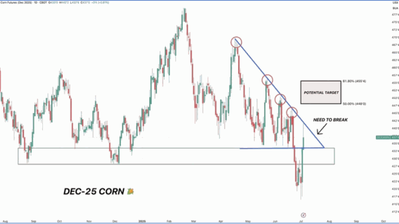 3. Ngô tháng 12 tiếp tục bị từ chối tại vùng kháng cự quan trọng, đánh dấu lần thất bại thứ 5 trước xu hướng giảm từ tháng 4. Nếu vượt được vùng này, giá có thể bật mạnh lên vùng $4.48–$4.55, tương ứng mức hồi 50–61,8% từ đỉnh tháng 2. Tuy nhiên, chừng nào chưa vượt qua, xu hướng giảm vẫn chiếm ưu thế và rủi ro còn cao.