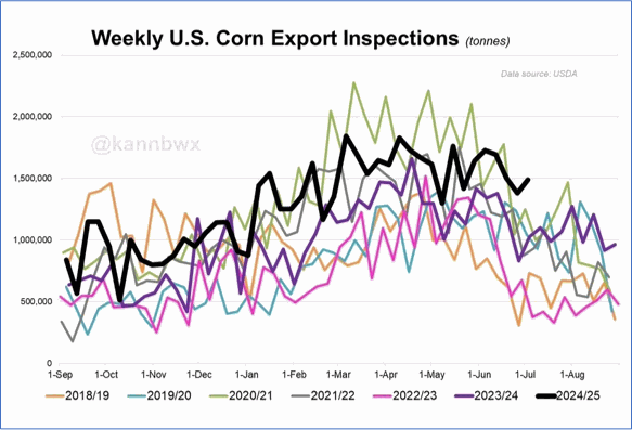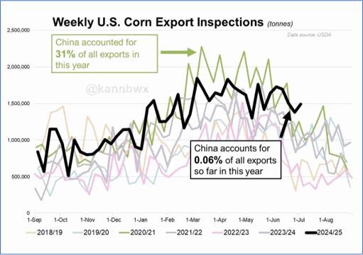 2. Trung Quốc chiếm 31% lượng ngô xuất khẩu của Mỹ trong niên vụ 2020/21. Tuy nhiên trong năm nay gần như bằng không. Tính đến hiện tại, khối lượng kiểm tra cho niên vụ 2024/25 thấp hơn khoảng 4% so với cùng kỳ 2020/21.