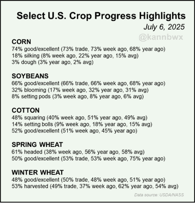 3. Tỷ lệ ngô Mỹ được đánh giá ở mức tốt đến xuất sắc đã tăng lên 74%, so với 68% vào cuối tháng 5. Trong khi đó, tình trạng đậu tương không thay đổi so với tuần trước, còn lúa mì xuân lại giảm so với kỳ vọng. Riêng thu hoạch lúa mì đông đã hoàn thành hơn một nửa diện tích.
