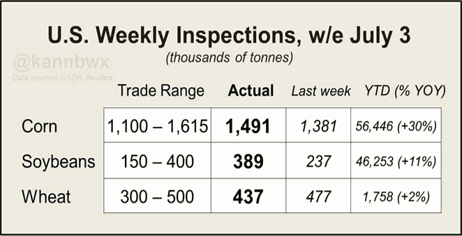 5. Kiểm tra xuất khẩu ngô tiếp tục diễn ra mạnh mẽ và đầy ấn tượng. Đậu tương cũng ghi nhận kết quả tương đối khả quan, cho thấy xuất khẩu nông sản Mỹ vẫn giữ được đà tích cực.