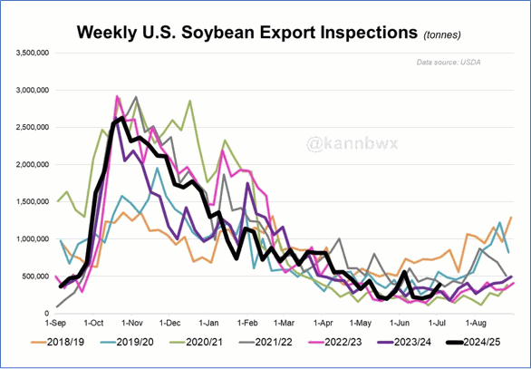 4. Kiểm tra xuất khẩu của Mỹ trong tuần qua nhìn chung khá tích cực so với kỳ vọng. Riêng lúa mì niên vụ 2025/26 cuối cùng cũng đã vượt so với cùng kỳ năm ngoái, dù niên vụ chỉ mới bắt đầu từ ngày 1/6.