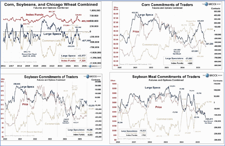 7. Các quỹ đầu cơ đang gia tăng mạnh vị thế bán ròng đối với ngô, đậu tương và đặc biệt là khô đậu sau khi vừa thiết lập mức kỷ lục mới. Áp lực bán này đang khiến giá các mặt hàng nông sản suy yếu. Trong khi đó, các tổ chức thương mại và quỹ chỉ số giữ vai trò cân bằng thị trường. Đồng thời, khả năng bán tháo vị thế mua trên thị trường heo cũng đang được nhắc đến.