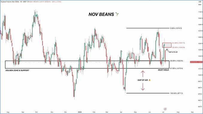 9. Giá đậu tương đang quay lại vùng hỗ trợ quan trọng quanh mức điều chỉnh 50–61,8% từ đỉnh tháng 6 về đáy tháng 4. Đây là vùng giá từng nhiều lần giúp thị trường bật lại kể từ mùa thu hoạch. Nếu không giữ được mốc $10.10, giá có thể giảm sâu hơn do thiếu hỗ trợ bên dưới đây là thời điểm then chốt để phe mua bảo vệ thị trường.