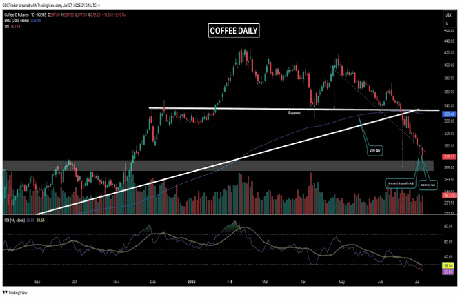 1. Giá cà phê tiếp tục chịu áp lực bán mạnh, với xu hướng giảm được phe bán kiểm soát hoàn toàn. Dù cuối tuần trước xuất hiện một số tín hiệu đảo chiều như nến hammer và spinning top, lực mua vẫn yếu và không có tín hiệu xác nhận theo sau. Thứ Hai, giá giảm thêm 4% với nến giảm mạnh, cho thấy đà giảm chưa kết thúc. RSI hiện ở mức 22 vùng quá bán nhưng đây không phải là tín hiệu mua nếu chưa có dấu hiệu đảo chiều rõ ràng. Kể từ ngày 10/6, chưa có phiên nào đóng cửa vượt đỉnh phiên trước, khẳng định xu hướng giảm vẫn chiếm ưu thế. Mô hình hai đỉnh đang diễn biến đúng theo dự đoán.