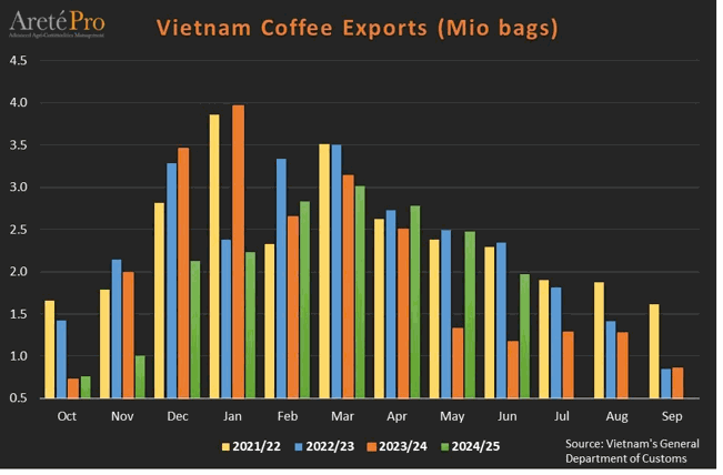2. Theo Tổng cục Hải quan Việt Nam, xuất khẩu cà phê trong tháng 6 đạt 2 triệu bao, tăng 68% so với cùng kỳ năm 2024 nhưng giảm 21% so với tháng 5/2025. Lũy kế từ đầu niên vụ (tháng 10 đến tháng 6), tổng xuất khẩu đạt 19,2 triệu bao, giảm 8% so với cùng kỳ niên vụ 2023/2024.