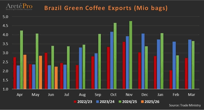 3. Xuất khẩu cà phê nhân trong tháng 6 đạt khoảng 2,2 triệu bao loại 60kg, giảm 34% so với tháng 6/2024 và giảm 21% so với tháng 5/2025.