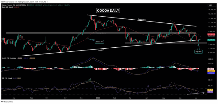 4. Phiên giao dịch đầu tuần cho thấy lực mua mạnh với mô hình nến đảo chiều "bullish engulfing", giúp giá phục hồi và lấy lại đường hỗ trợ tăng. RSI cũng xuất hiện phân kỳ dương, cho thấy tín hiệu đảo chiều tiềm năng. Nếu xu hướng tích cực tiếp diễn trong phiên tới, đây có thể là khởi đầu cho nhịp hồi từ vùng hỗ trợ đối với giá ca cao.