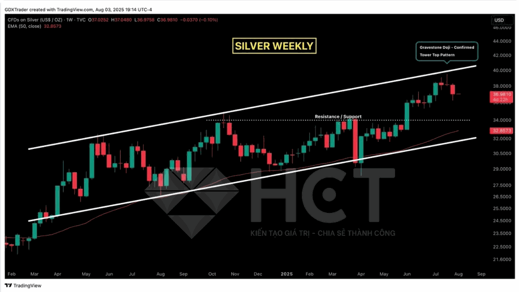 Biểu đồ tuần của bạc đã xác nhận nến Doji tại vùng kháng cự kênh giá trên, với cây nến giảm mạnh tuần qua củng cố tín hiệu đảo chiều. Sau khi vượt ngưỡng kháng cự ngang vào đầu tháng 6 và chạm đỉnh kênh như kỳ vọng, lực mua suy yếu rõ rệt. Đây là vùng hợp lý để chốt lời và tạo điều kiện cho xu hướng điều chỉnh giảm bắt đầu.