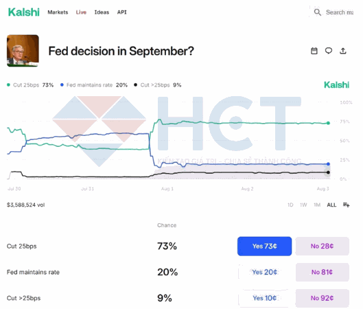 Thị trường đang định giá 73% khả năng Fed sẽ cắt giảm lãi suất 25 điểm cơ bản (bps) trong cuộc họp tháng 9. Nếu cộng thêm 9% khả năng cắt sâu hơn (>25bps), thì tổng xác suất cắt giảm lãi suất đạt tới 82% – cho thấy niềm tin rất cao rằng Fed sẽ xoay trục chính sách trong bối cảnh dữ liệu kinh tế yếu đi và áp lực lạm phát hạ nhiệt.