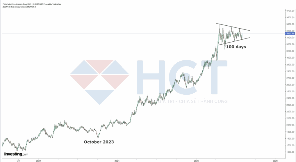 Giá vàng đã bắt đầu chu kỳ tăng mạnh từ tháng 10/2023 và đến nay đã tăng khoảng 86%. Từ đỉnh $3.500 ngày 21/4/2025, vàng đã bước vào giai đoạn tích lũy kéo dài suốt 100 ngày – dài nhất kể từ khi đà tăng bắt đầu.