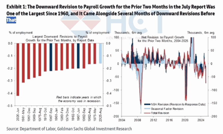 Đáng chú ý, những lần điều chỉnh sâu như thế này trong lịch sử thường trùng khớp với các giai đoạn suy thoái. Điều này làm dấy lên lo ngại rằng thị trường lao động Mỹ – vốn là chốt chặn cho chính sách của Fed – đang mất đà mạnh hơn so với dữ liệu ban đầu.