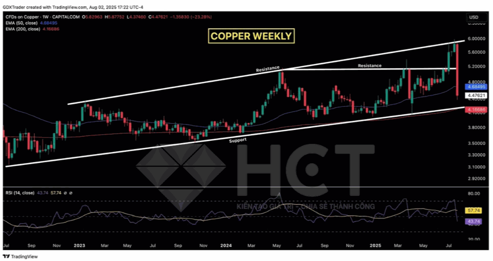 Giá đồng vừa trải qua đợt giảm mạnh 23% trong tuần qua, hình thành mô hình nến nhấn chìm giảm ngay tại vùng kháng cự của kênh giá tăng.