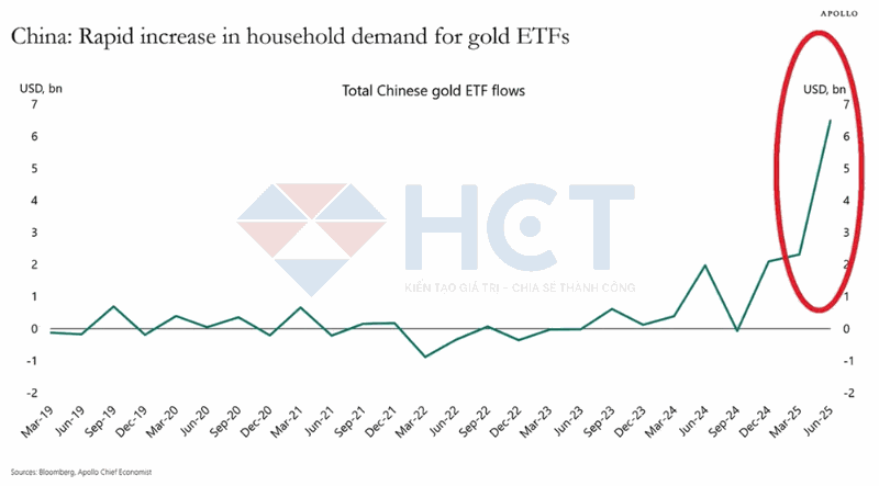 Dòng tiền đổ vào các quỹ ETF vàng tại Trung Quốc đã vượt mốc 6 tỷ USD, thiết lập mức cao kỷ lục mọi thời đại. Chỉ trong vòng 3 tháng, lượng mua ròng tăng gấp đôi, phản ánh tâm lý phòng thủ và tìm nơi trú ẩn tài sản ngày càng mạnh mẽ. Trong bối cảnh bất ổn kinh tế và tiền tệ khu vực, châu Á – đặc biệt là Trung Quốc – đang thể hiện khẩu vị vàng chưa từng có.