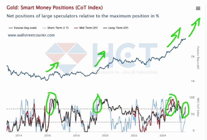Chỉ số CoT Index cho thấy vị thế của các nhà đầu cơ lớn đã quay trở lại vùng mua, trùng thời điểm giá vàng đang tích lũy. Trong quá khứ, mỗi khi chỉ số này vào vùng mua, giá vàng đều có xu hướng bứt phá mạnh sau đó. Điều này cho thấy dòng tiền thông minh đang trở lại thị trường vàng, và khả năng vàng bước vào một chu kỳ tăng mới trong trung hạn là rất cao.