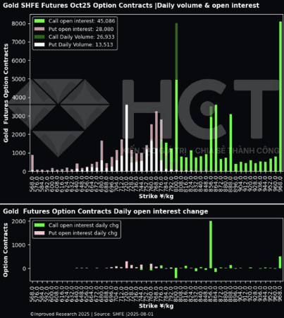 Giá vàng SHFE kỳ hạn tháng 10/2025 đóng cửa tăng nhẹ 0,1% lên ¥770,72/g (tương đương khoảng $3.325/oz trên sàn COMEX), trong bối cảnh dữ liệu quyền chọn cho thấy tâm lý thị trường nghiêng về chiều tăng giá.