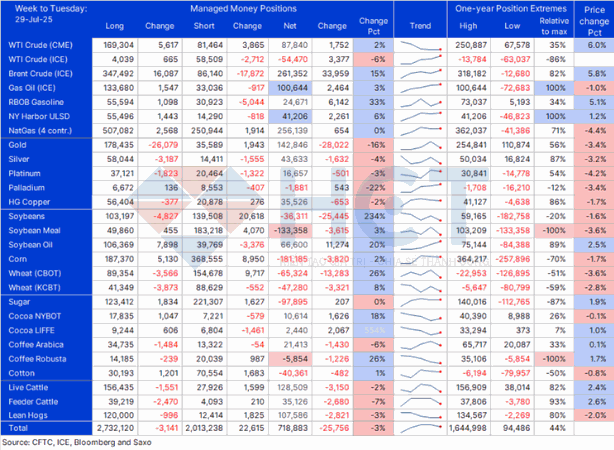 Tổng thể, các nhà đầu cơ đang xoay vòng danh mục rõ rệt theo hướng ưu tiên năng lượng và tránh xa kim loại quý cũng như nông sản.