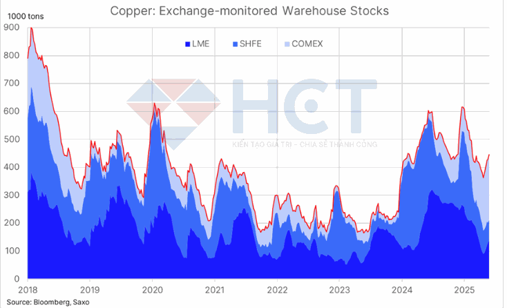 Kể từ tháng 3, mối đe dọa về thuế nhập khẩu 50% đã khiến tồn kho đồng tại kho giám sát bởi COMEX tăng 179%, đạt mức kỷ lục 234 nghìn tấn, vượt qua cả đỉnh lịch sử năm 2018. Làn sóng đổ đồng vào Mỹ trước khi thuế có hiệu lực đã mang lại lợi nhuận đột biến cho các thương nhân.