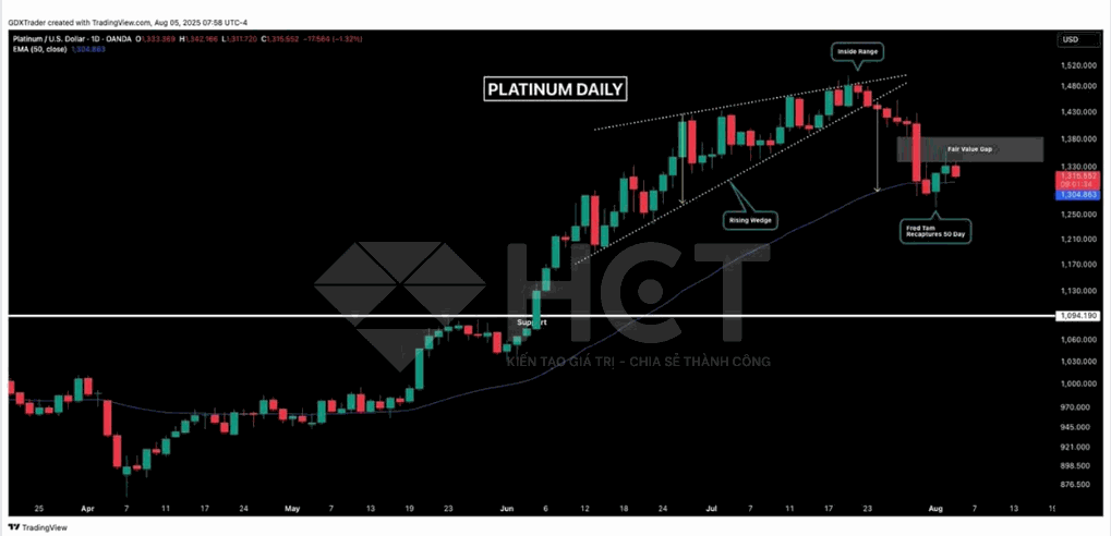 Giá bạch kim cho thấy tín hiệu suy yếu khi hình thành nến nhấn chìm giảm gần đường MA50. Thiếu sự xác nhận từ các chỉ báo kỹ thuật, phe mua tỏ ra do dự và rủi ro bật giá thất bại vẫn cao. Chiến lược lúc này: kiên nhẫn, không nên vội vàng mở vị thế.