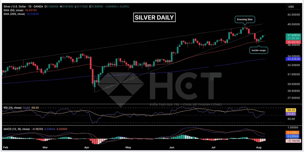 Giá bạc đã xác nhận tín hiệu tăng từ vùng hỗ trợ đường MA 50 ngày bằng cây nến tăng vào thứ Hai. Tâm lý thị trường đang nghiêng về phe mua, nhưng vùng kháng cự $38 là rào cản tiếp theo cần vượt qua để tiếp tục xu hướng tăng.