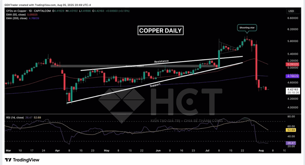 Giá đồng tiếp tục giảm với tín hiệu xác nhận từ nến bearish, RSI ở mức quá bán nhưng chưa có dấu hiệu đảo chiều. Tâm lý thị trường vẫn nghiêng về bi quan, và chưa có mô hình kỹ thuật cho thấy sự hồi phục sắp tới. Giai đoạn này nên thận trọng, tránh bắt đáy vội vàng.