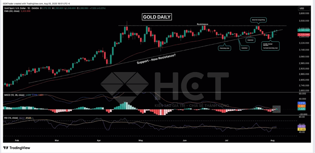 Vàng xác nhận mô hình Morning Star với chuỗi tăng liên tục. Dù xuất hiện nến do dự (spinning top) ở vùng kháng cự, phe mua vẫn kiểm soát và giữ vững đà tăng. Động lực hiện nghiêng về khả năng phá vỡ vùng cản phía trên.