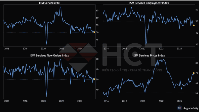 Chỉ số PMI dịch vụ ISM bất ngờ giảm xuống 50.1, thấp hơn kỳ vọng 51.5, cho thấy đà mở rộng trong lĩnh vực dịch vụ đang chững lại. Đáng chú ý, chỉ số việc làm tiếp tục suy yếu mạnh xuống 46.4 trong khi áp lực lạm phát gia tăng với chỉ số giá tăng vọt lên 69.9, mức cao nhất kể từ tháng 10/2022.