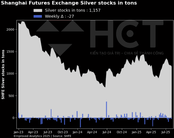 Dự trữ bạc tại Sở Giao dịch Hàng hóa Thượng Hải (SHFE) tiếp tục giảm mạnh, đánh dấu tuần giảm thứ 4 liên tiếp với mức sụt 27 tấn, đưa tổng lượng bạc tồn kho còn lại chỉ 1.157 tấn (~37,2 triệu ounce).