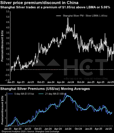 Bạc tại Trung Quốc hiện cao hơn giá LBMA tới $1.85/oz – tương đương 5.1%, cho thấy nhu cầu vật chất nội địa vẫn đang duy trì ở mức cao giữa bối cảnh tồn kho bạc tại SHFE liên tục giảm.
