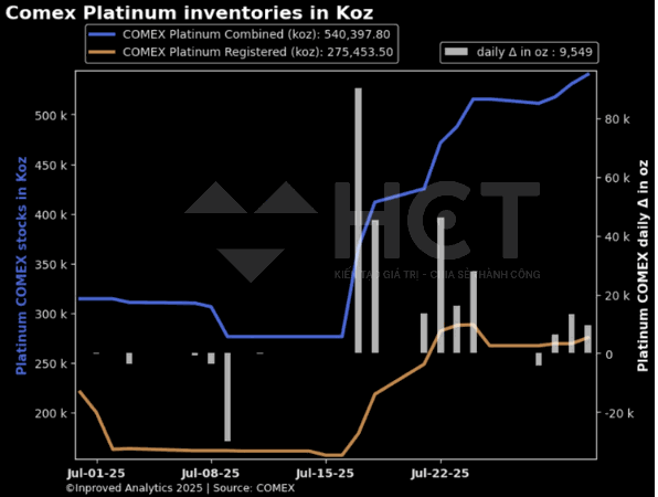 Tồn kho bạch kim tại COMEX hiện đang tiến sát đỉnh tháng 3, đạt mức 540.000 oz (~17 tấn). Chỉ tính riêng tuần trước, COMEX đã bổ sung thêm 25.000 oz, cho thấy động thái tích trữ mạnh mẽ giữa bối cảnh giá cả biến động và lo ngại cung-cầu trong dài hạn.