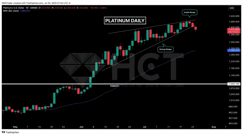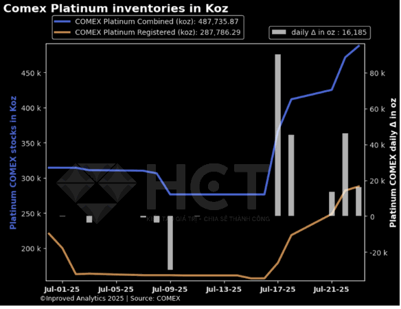 Trong 5 ngày liên tiếp, kho dự trữ bạch kim tại COMEX ghi nhận lượng lớn đổ vào, nâng tổng lượng tồn kho lên 487.736 oz, tương đương mức tăng 76,5% chỉ trong tháng 7. Đáng chú ý, tồn khi sẵn sàng giao cũng tăng mạnh 83,3%, đạt gần 287.800 oz.