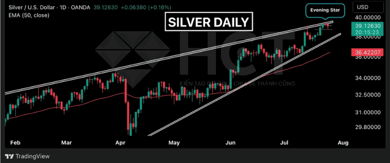 Bạc xuất hiện tín hiệu evening star yếu tại kháng cự nêm tăng. Nếu giá phá vỡ hỗ trợ, khả năng điều chỉnh sâu sẽ xảy ra. Mô hình chưa xác nhận nhưng áp lực chốt lời có thể gia tăng, cần theo dõi sát.