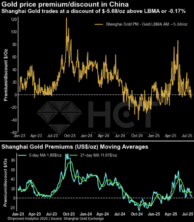 Theo dữ liệu mới nhất, mức chiết khấu đang mở rộng lên -0,32%, đưa giá vàng tại Trung Quốc xuống chỉ còn khoảng 3.371,7 USD/oz, thấp hơn so với thị trường quốc tế. Động thái này cho thấy lực cầu trong nước đang suy yếu. Nếu xu hướng này tiếp tục, đây có thể là một tín hiệu tiêu cực cho tâm lý đầu cơ vàng vật chất.