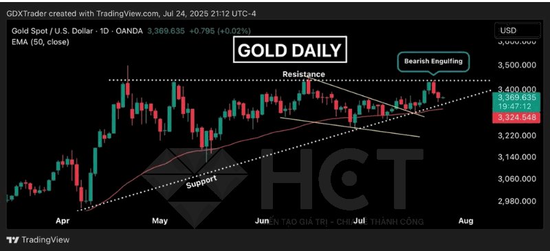 Giá vàng bị từ chối lần thứ tư tại kháng cự tam giác, tạo nến nhấn chìm giảm, nhưng mô hình tăng vẫn duy trì. Thị trường sắp đến điểm bứt phá, nhà đầu tư cần theo dõi sát hướng phá vỡ cuối cùng.