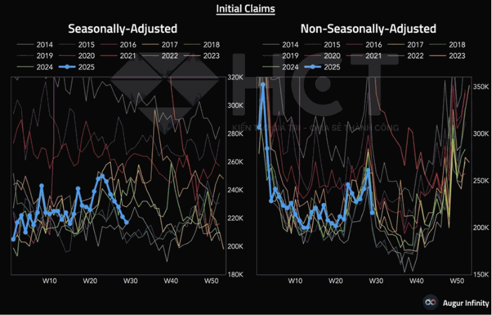 Số đơn xin trợ cấp thất nghiệp lần đầu tại Mỹ bất ngờ giảm xuống còn 217.000, thấp hơn đáng kể so với mức dự báo 226.000. Trung bình 4 tuần cũng tiếp tục giảm, cho thấy áp lực sa thải vẫn chưa lan rộng trong nền kinh tế.