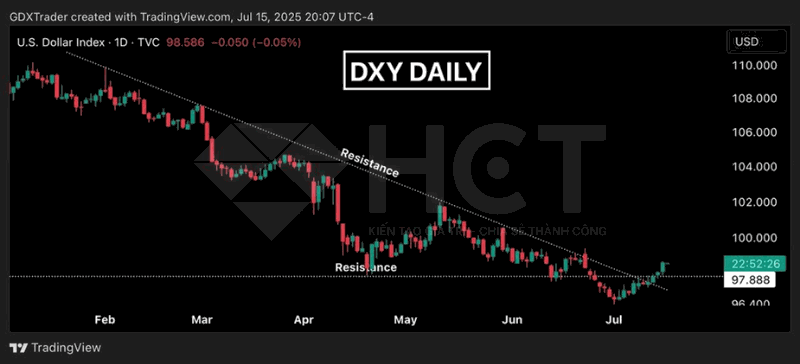 DXY tăng 0.55% và đang tiếp cận mức kháng cự quan trọng. Nếu phá vỡ, DXY có thể báo hiệu sự thay đổi xu hướng và tiếp tục gây áp lực lên giá kim loại trong ngắn hạn.